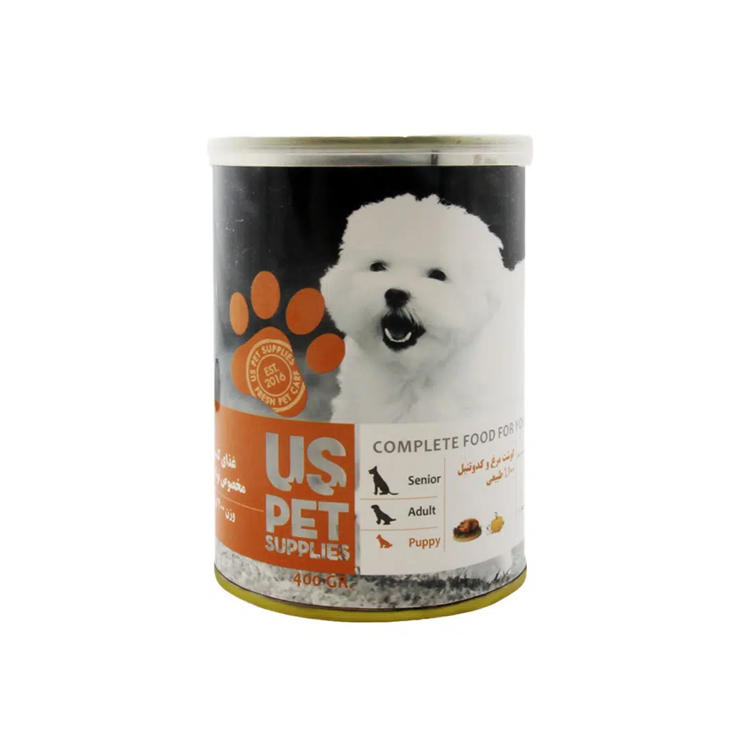 کنسرو توله سگ یو اس پت طعم مرغ و کدو وزن۴۰۰ گرم